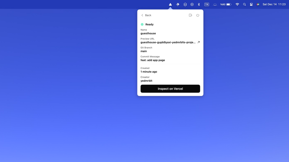- Quick Access: View your latest Vercel deployments instantly with a single click—no browser required.