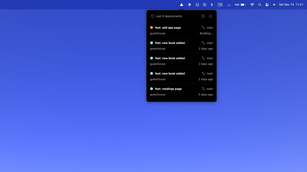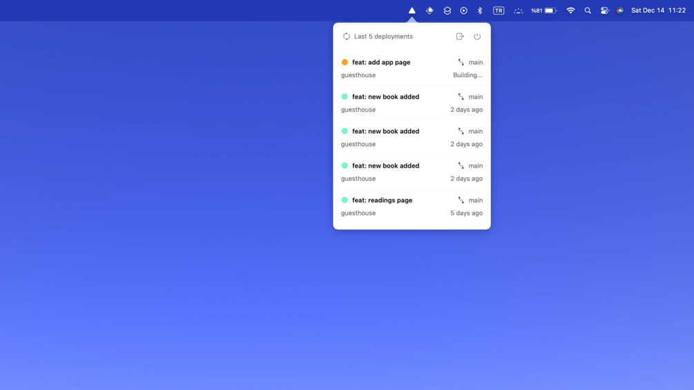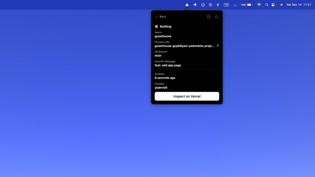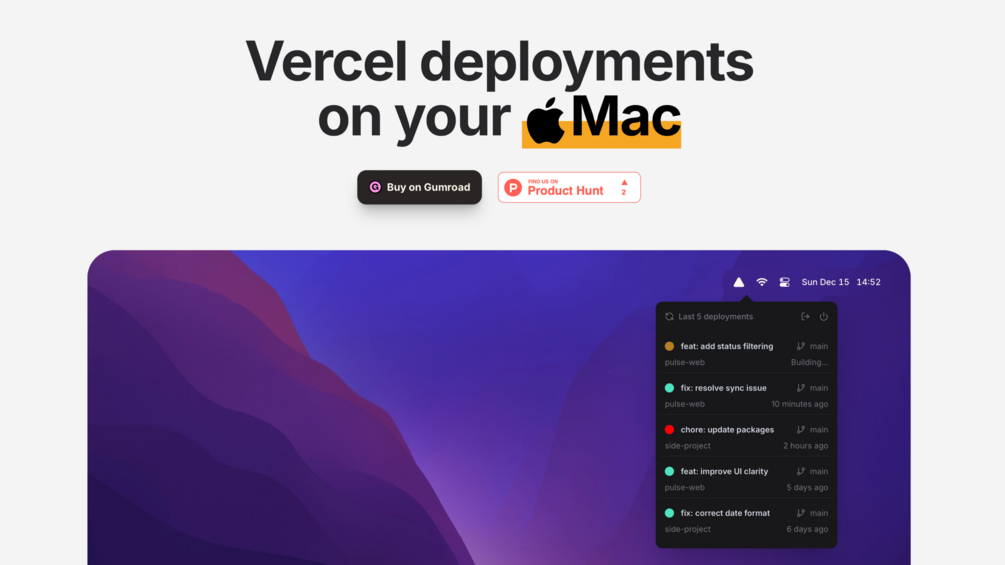 Monitor your Vercel deployments on your Mac—no need to open the web app! With Pulse for Vercel, all your deployment updates are just one click away, right from your Mac’s menu bar.